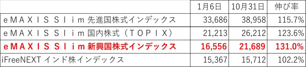 これらの基準価額が今年1月6日から10月31日時点でどれくらい伸びたかを比較します。
