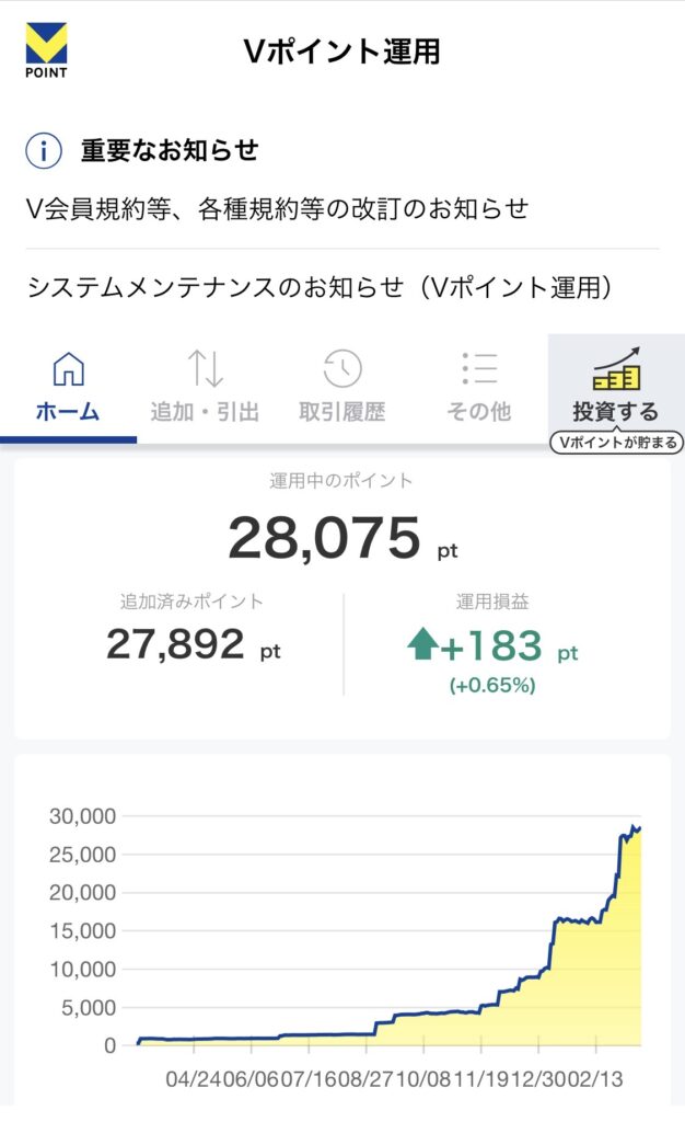 昨年初夏あたりから獲得したVポイントを運用にまわし、現在では運用額28,075ポイントになっています。