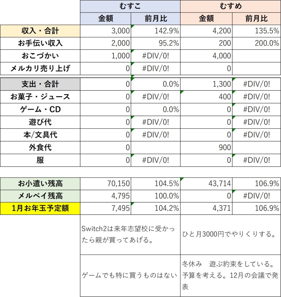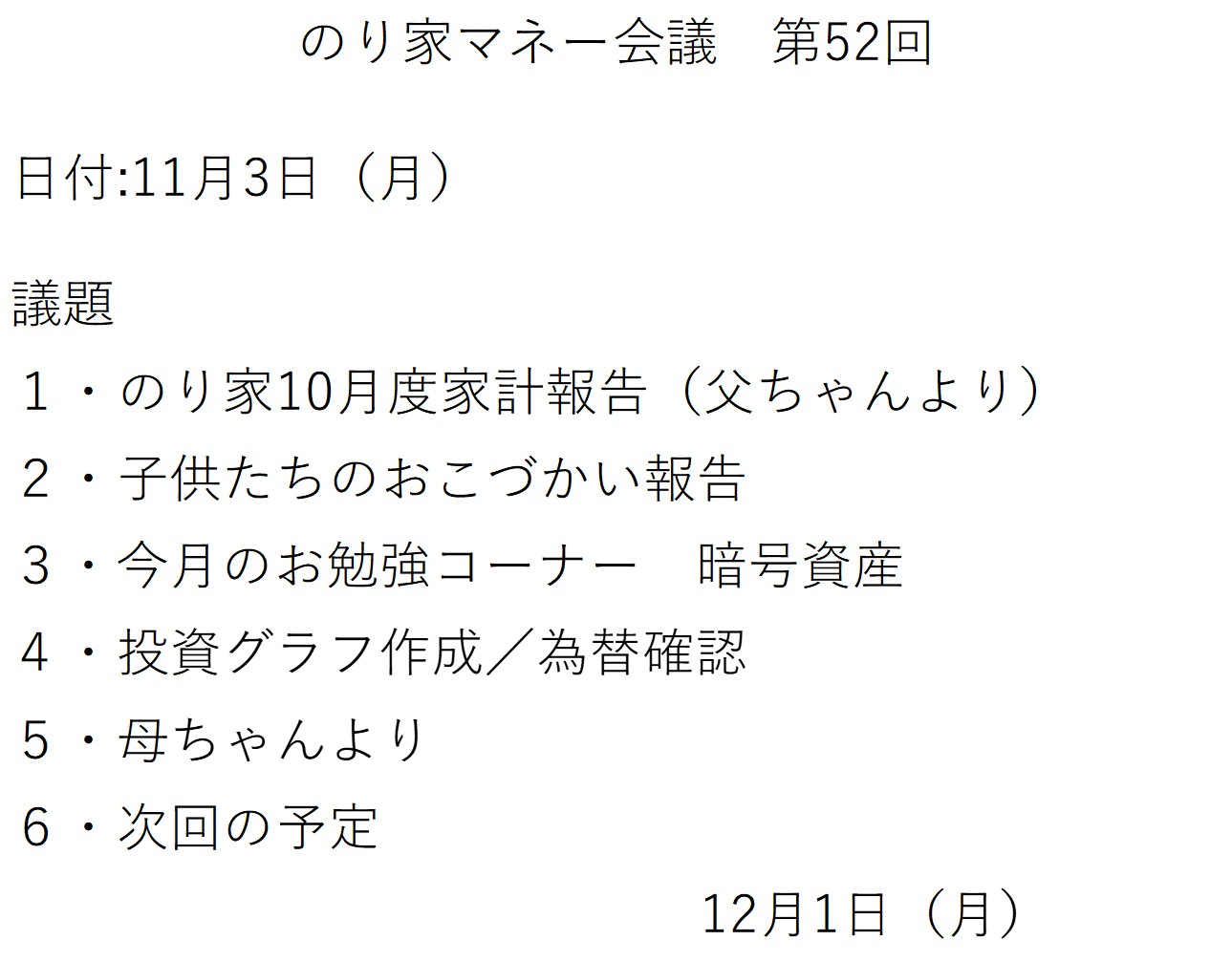 2025年11月3日(月)に月1で家計の情報を家族にシェアするのり家マネー会議を開催しました。