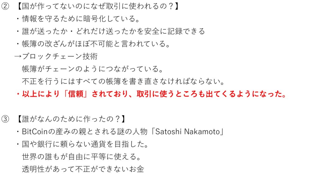 私「そう、国に対する信頼=通貨への信頼だね。じゃあ、この暗号資産の信頼ってどこにあるんだろうか見ていこう。」