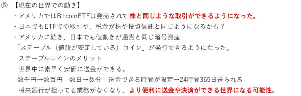 このステーブルコインというのは1ドル=1コイン 1円=1コインのように価値が通貨と連動していて既成の暗号資産のように値動きが激しいものでじゃない。その代わり、決済スピードやコストが既存の通貨よりも段違いに早くかつ安価になっているから、さっき出てきた『マイケル』との個人間取引をする世界が現実化していくんだよ。便利なものは普及していく可能性が高い。アメリカではUSDTやUSDCというステーブルコインが発行されているけど、日本でも円と連動するステーブルコインの発行が認可されて、つい先日日本初のステーブルコインJPYCの発行がはじまった。