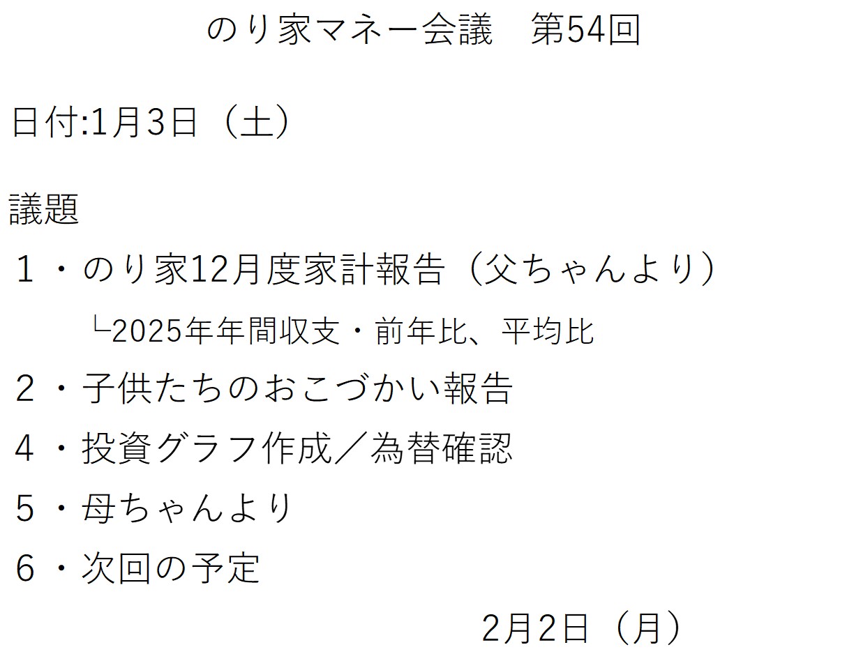 2026年1月3日(土)に月1で家計の情報を家族にシェアするのり家マネー会議を開催しました。