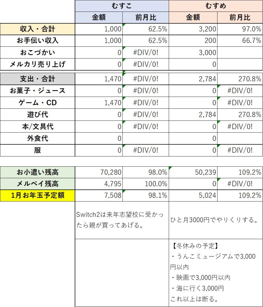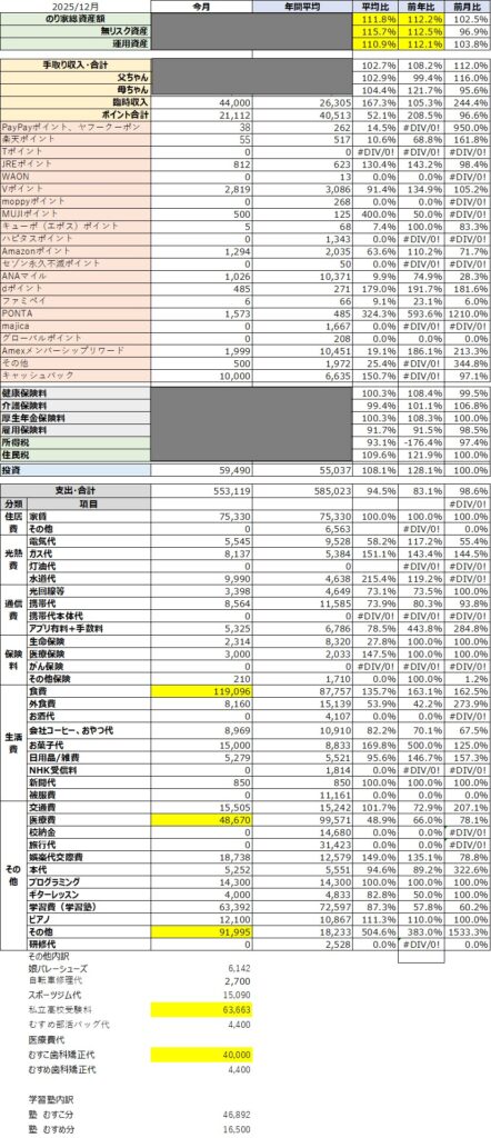 特記事項としては12月で息子の歯列矯正代の最後の支払いを行った。これで88万円分支払い完了。次は2026年の1月-3月にかけて今度は娘の歯列矯正代の残金60万円の支払いが発生する。