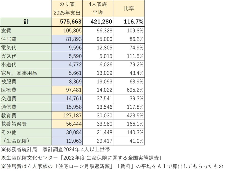 私「これが子ども二人いる4人家族の平均値との比較。本当は首都圏住みで子ども二人中学生の場合と比べたかったんだけど、AIに抽出させようとしたら具体的な数字は出てこなかったから、ざっくり全国の平均との比較になる。