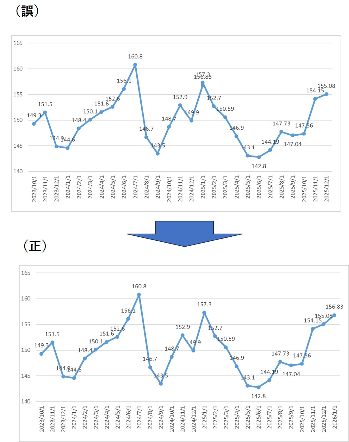 今回の数字を「2025年1月」と打ち込んでしまい「2025年1月」が2つインプットされていたのです。そのことにすぐに気づいた娘は「あ、2025年だからだ。」と今回の日付を正しく2026年に直して再表示したのが下の(正)グラフです。