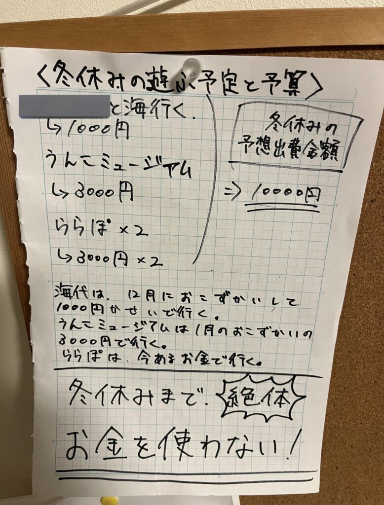 夏休みに大散財をしてしまい、預金を親に取り上げられた娘ですが、今年は冬休みに入る前に次のように冬休み期間のお金の利用の計画を立てました。